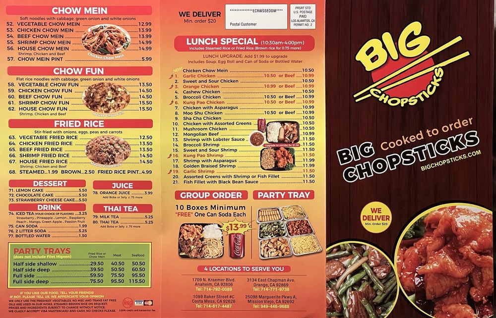 Welcome to Big Chopsticks, your go-to destination for Chinese comfort food in Anaheim, CA. This casual eatery is perfect for families, friends, and anyone craving hearty portions of delectable dishes. With a variety of options, including many vegetarian selections, Big Chopsticks truly caters to all diners.